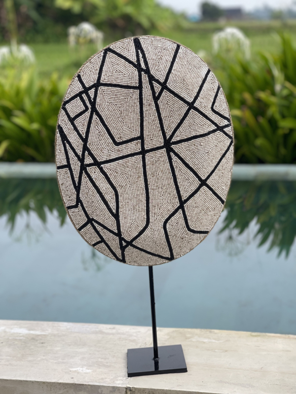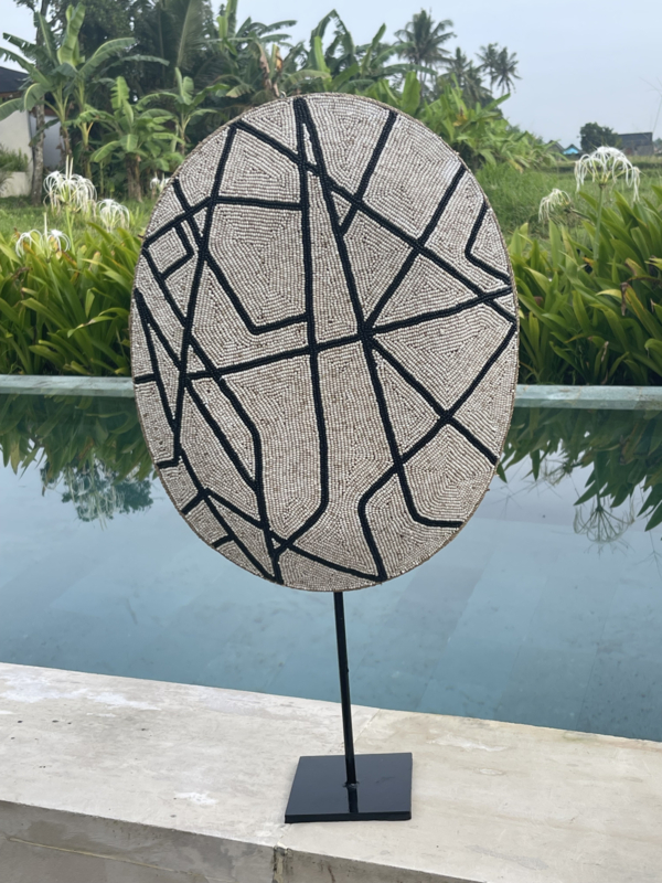 Elk ornament is met liefdehandgemaakt in Bali door getalenteerde ambachtslieden Dit handgemaakte ornament is een waar kunstwerk, waarbij de zorgvuldig bevestigde kralen zijn aangebracht op een houten ovaal. Het ornament hangt op een zwarte standaard zodat u dit elegante decoratie stuk een plek geven in uw vakkenkast of dressoir, dit ornament past in veel interieurs door de rustige kleuren