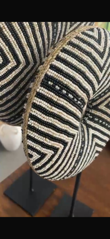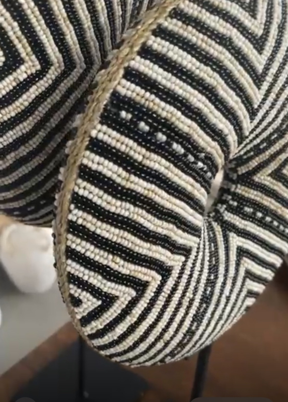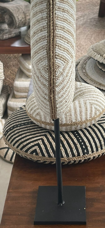 Elk ornament is met liefdehandgemaakt in Bali door getalenteerde ambachtslieden Dit handgemaakte ornament is een waar kunstwerk, waarbij de zorgvuldig bevestigde glaskralen zijn aangebracht op een masief houten ondergond Het ornament hangt op een zwarte standaard zodat u dit elegante decoratie stuk een plek geven in uw vakkenkast of dressoir, dit ornament past in veel interieurs door de rustige kleuren