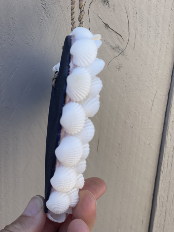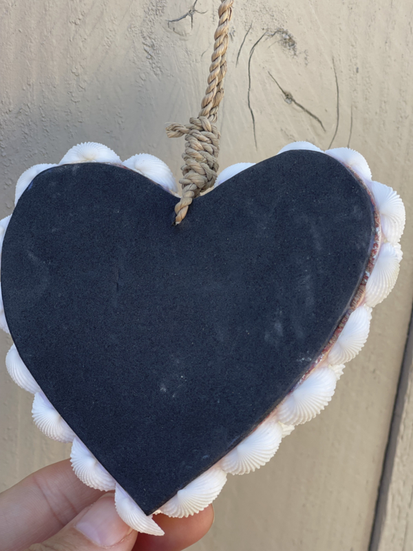 uitvoering: schelpen zijn verwerkt tot bloemvormig op een hartvorming ondergrond, een zijde is bedekt met schelpen de achterkant is zwart