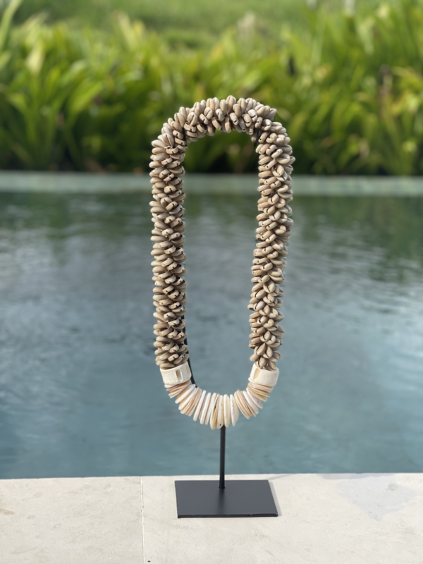 De cowrie ketting heeft een breedte van 17 cm en een totale hoogte van 54 cm op een zwarte standaard