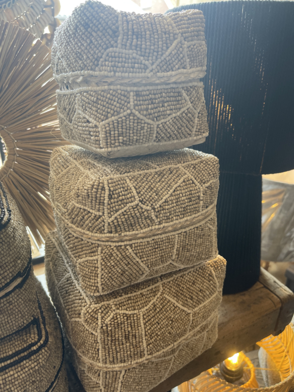 Kralenmanden/ offermanden uit Bali, versierd met kralen en schelpen!