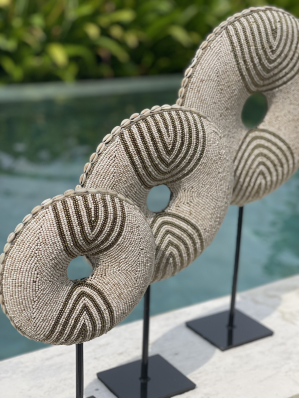 Donut kralen ornament op standaard AMBONDonut Kralen Schelpen ornament AMBON te verkrijgen in 3 maten en in de kleur zand /goud in de maten 20, 25 en 30 cm doorsnede een mooie aanvulling in uw vakkenkast of vensterbank